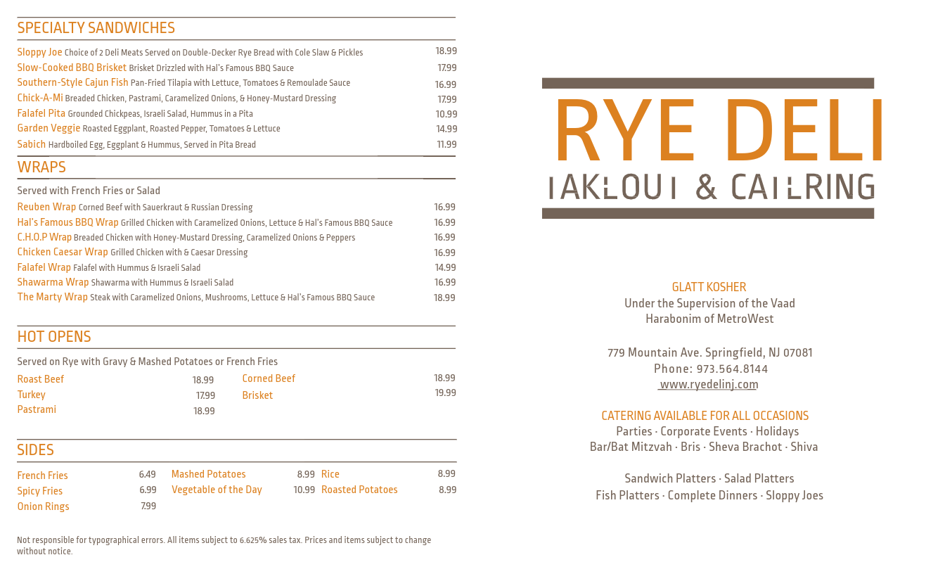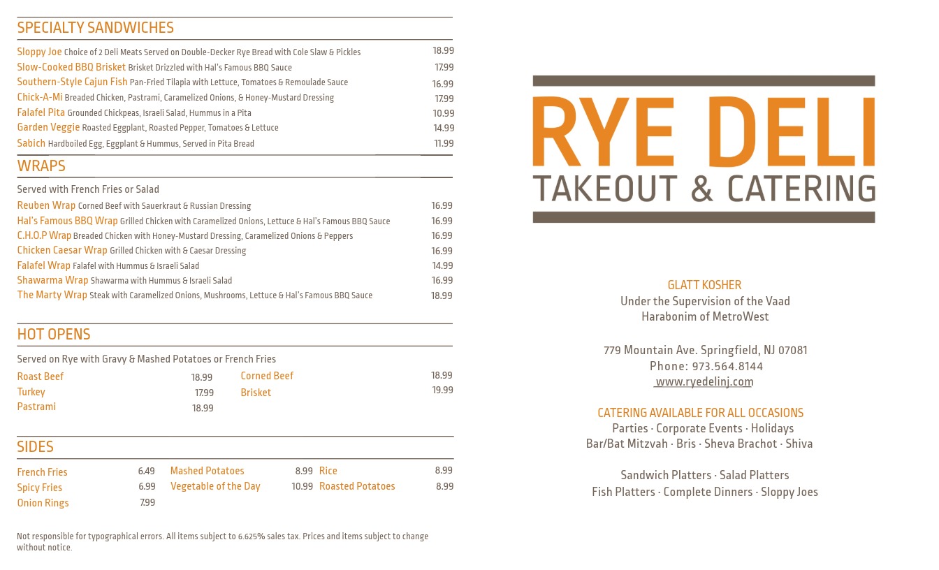 Click Here for Menu Feel free to call us at 973-564-8144 to place your immediate order or email us at ryedelinj@gmail.com for catering and general inquiries.